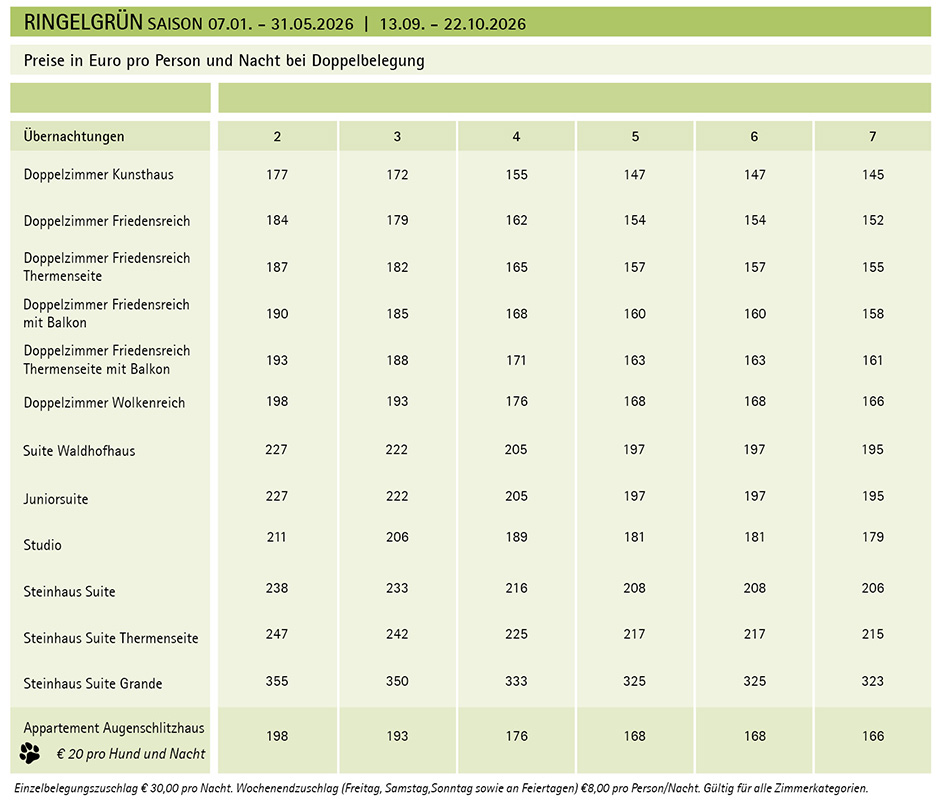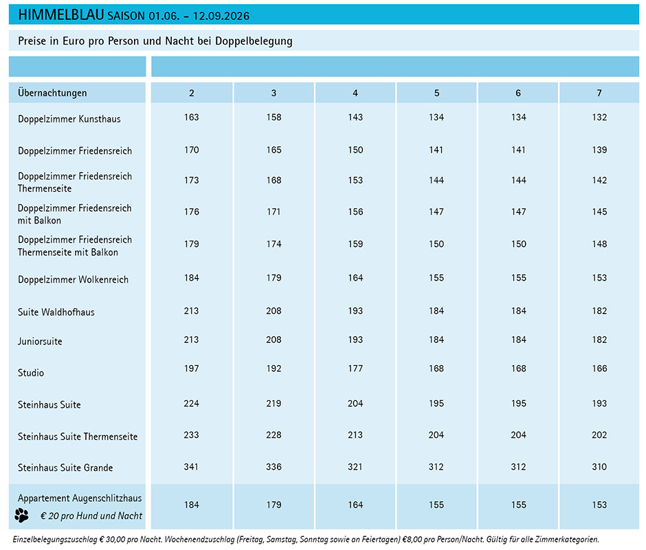 Ausgenommen Feier- und Fenstertage sowie Weihnachten und Neujahr. Zuschlag von € 8 pro Person/Nacht am Wochenende (Nächtigungen Freitag, Samstag & Sonntag) sowie an Feier- und Fenstertagen.