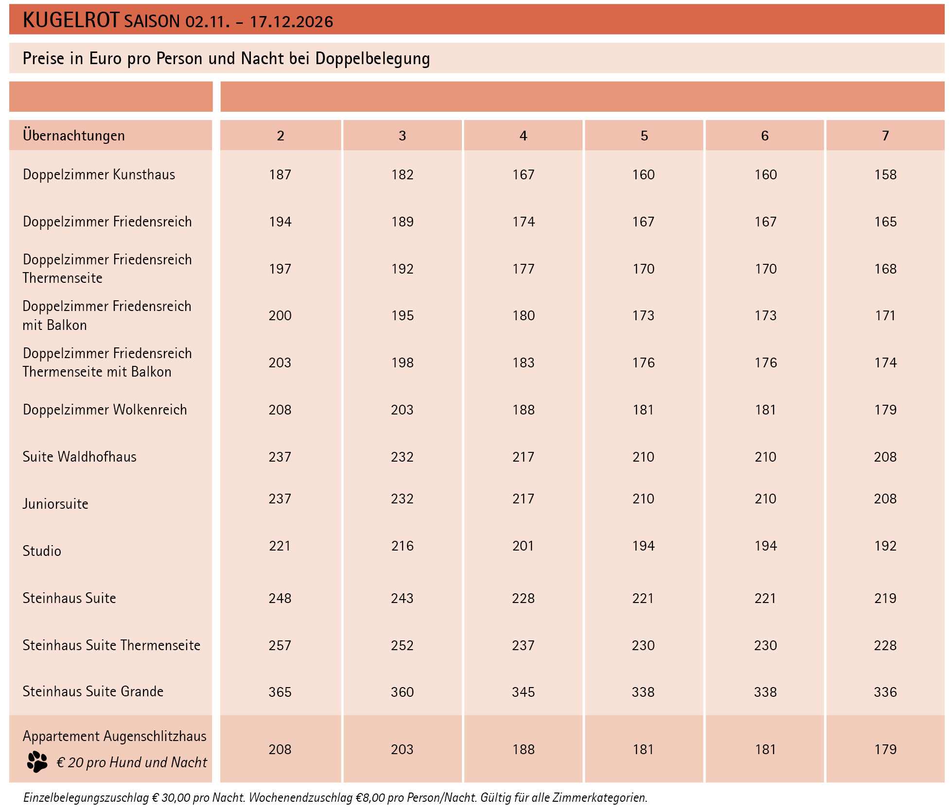 Preise pro Person/Nacht bei 2er-Belegung mit Halbpension sowie allen Inklusivleistungen. Exklusive Kur- und Nächtigungsabgabe, inklusive Mehrwertsteuer. Preise und Verfügbarkeiten für Mehrbelegung sowie Kinderermäßigungen auf Anfrage.